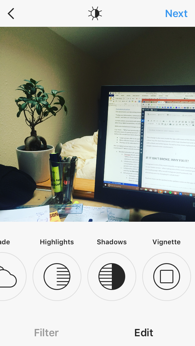 But now that Instagram has been established as a cultural phenomena in it’s own right – its design doesn’t need to explain what it does. We know already! So the ‘volume’ of skeuomorphism in it’s design can be ‘turned down’ from 11, to closer to a 3.